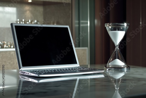 Hourglass on laptop computer concept for time management, Generative AI