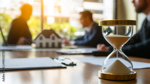 hourglass on table in bright office setting with blurred people in background, symbolizing time management and business planning