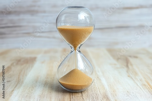Hourglass on wooden table, time passing, background blurred