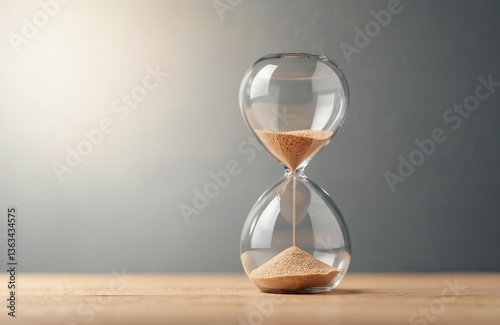 Hourglass on wooden table with copy space. Sand flows through transparent glass. Time concept, deadline, past, future. Business, science or education themes. Minute timer instrument, retro design.