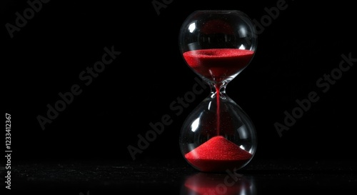 hourglass, red sand, time concept, black background, transparent glass, dramatic lighting, high contrast, minimalist, cinematic, symbolic, time running out, sleek design, close-up, reflective surface,