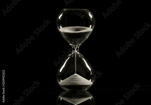 hourglass, sand, time, reflection, black background, minimalist, dramatic lighting, glass, transparent, symbolic, still life, contrast, monochrome, detail, dark mood, artistic, contemplative, time pas