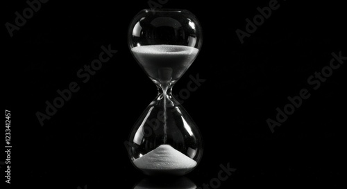 hourglass, sand timer, black and white, high contrast, minimalist, conceptual, time passing, dramatic lighting, reflective surface, studio photography, still life, transparent glass, falling sand, dar
