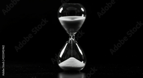 hourglass, sand timer, black and white, high contrast, minimalist, conceptual, time passing, dramatic lighting, reflective surface, studio photography, still life, transparent glass, falling sand, dar