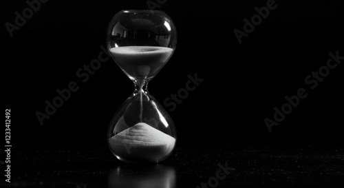 hourglass, sand timer, black and white, high contrast, minimalist, conceptual, time passing, dramatic lighting, reflective surface, studio photography, still life, transparent glass, falling sand, dar