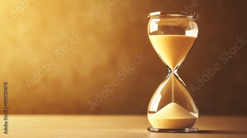 Hourglass sits on a wooden surface, with golden sand flowing through the narrow center, symbolizing the passage of time, deadlines, and the importance of time management