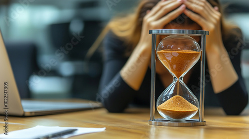 hourglass sits on an office desk, symbolizing the urgency of time running out. The blurred background emphasizes focus on the passing moments, representing deadlines, productivity, and life's fleeting