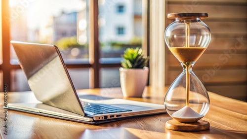 Hourglass timer surrounded by scattered papers, pens, and laptop, on a cluttered wooden desk, against a blurred background.