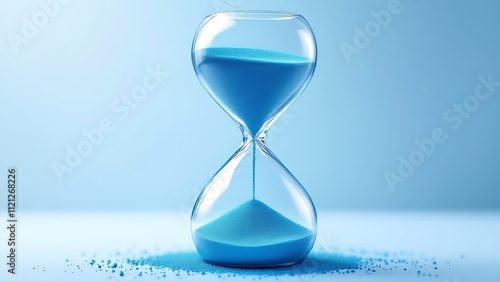 Hourglass with blue sand on a soft blue background, symbolizing the passage of time and life s fleeting moments, emphasizing the importance of time management and reflection