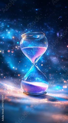 Hourglass with Colorful Sand Against Cosmic Background Depicting Passage of Time