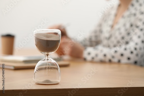 Hourglass with flowing sand on desk. Woman working indoors, selective focus