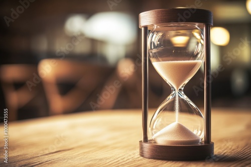 Hourglass with sand falling, symbolizing time passage, on wooden table with blurred background.