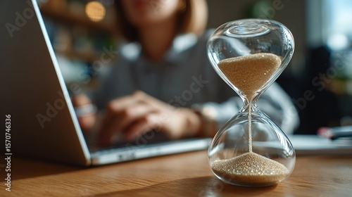 Hourglass with sand flowing on a desk in front of a person working on a laptop