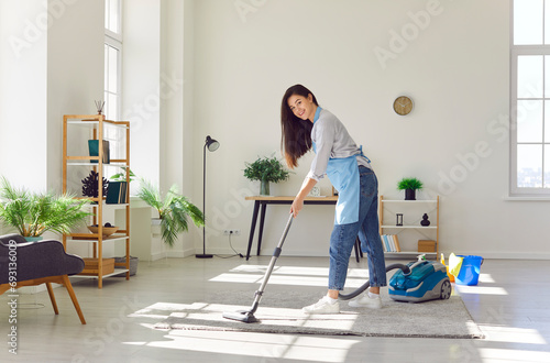 House cleaning. Portrait of cheerful energetic female housekeeper cleaning apartment with vacuum cleaner. Young woman in apron keeps clean at home and does housework. Domestic hygiene concept.