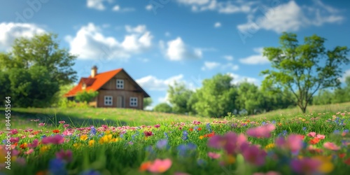 house, Countryside Farmhouse Quaint blurred background image of a farmhouse surrounded by lush fields, blooming flowers, and a clear sunny sky.