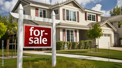 House for sale. A stunning real estate photograph of a suburban home with a "for-sale" sign in the yard, indicating that the property has already been sold