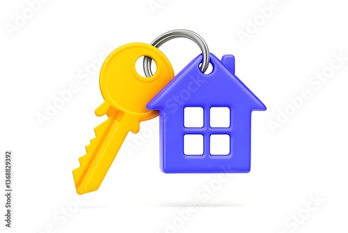 House key with house shaped keychain isolated on white background - real estate concept