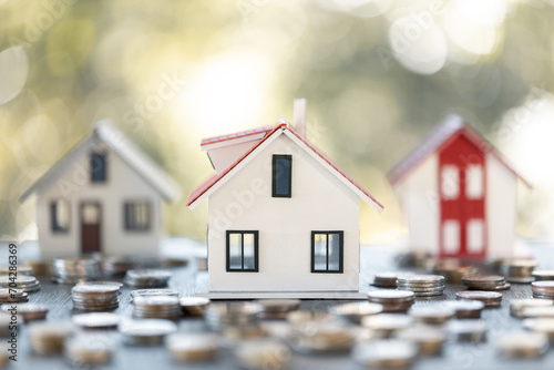 House model and coins stack on wooden table. Concept of saving money for home, mortgage of property, building investment, real estate interest, bank loan, insurance business, finance, accounting