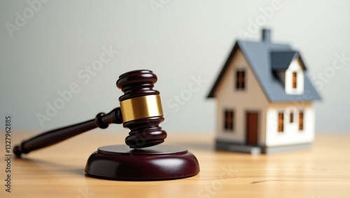 House model, judge's hammer on a wooden table with a background. Foreclosure and bankruptcy theme. An individual is unable to manage outstanding debts or obligations and ceases mortgage payments.