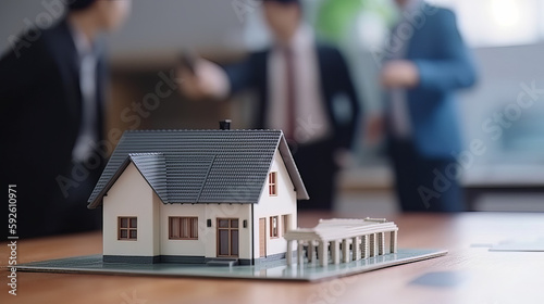 House model with agent and customer discussing for contract to buy, get insurance or loan real estate or property