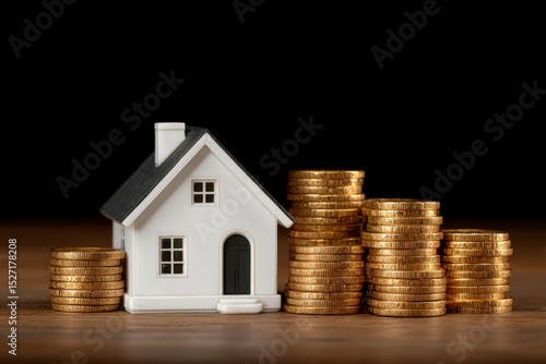 House Model with Gold Coins Homeownership Finance Savings Investment Real Estate