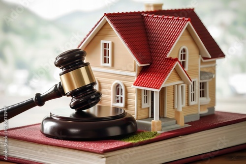 House Model with Red Roof and Gavel Resting on Law Book in Close-up View
