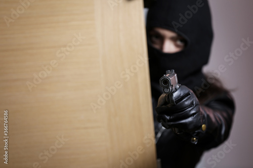 House robbery by woman in a black jacket and black mask holding black gun. Burglar in a mask. Thief in a mask trying to break into other people's apartments