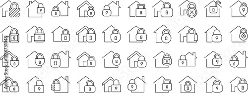 House with Lock Line Icon Bundle. Minimalistic Linear Pictogram for Web and Graphic Design, Apps, Banners, Social Network and Cards