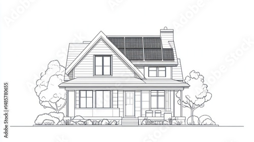 House with solar panels architectural drawing, front view, blueprint, home design