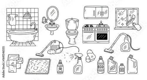 Household Cleaning Items: A monochrome illustration showcases an array of essential household cleaning items, meticulously organized and ready for action.