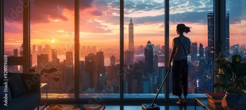 Housekeeper Cleaning City Apartment Windows Overlooking Stunning Sunset Skyline - Urban Chores