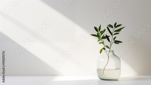 Houseplant in transparent vase with bright sunlight casting soft shadows on white wall for lifestyle and decor inspiration