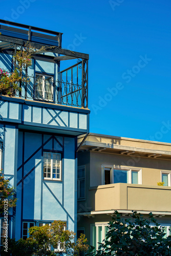 Houses and homes on lombard street in historic san francisco districts in downtown city neighborhood