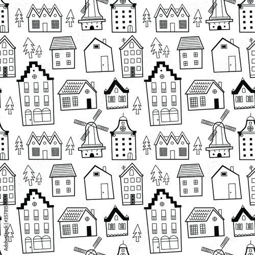 Houses seamless pattern. Ideal for background, wallpaper, textile, backdrop, wrapping paper. Pattern design.