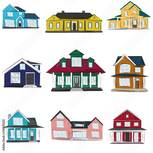 Houses vector illustration, front view exterior sketch illustration of american houses and homes. Icon or web site of realty estate design.