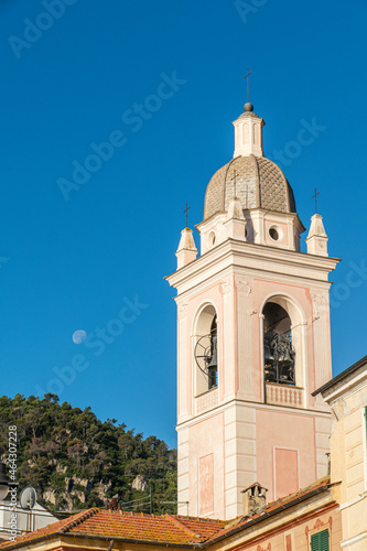 houses with beautiful facades and bell tower in Noli