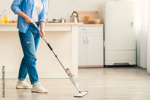 Housewife. Portrait of casual woman washing hardwood laminate flooring using water spray mop pad and refillable bottle with cleaning agent. Blurred Kitchen Background, Free Copy Space, Modern Interior
