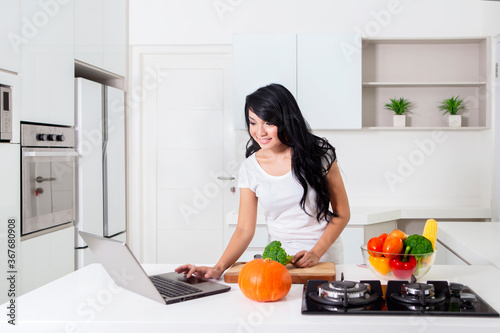 Housewife using laptop and preparing to make food
