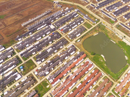 Housing Development in Bandung City - Indonesia. Aerial drone view of public housing on the edge of the city. View from above, Housing Development. Above. Social issues. Shot from drone flying 100 met