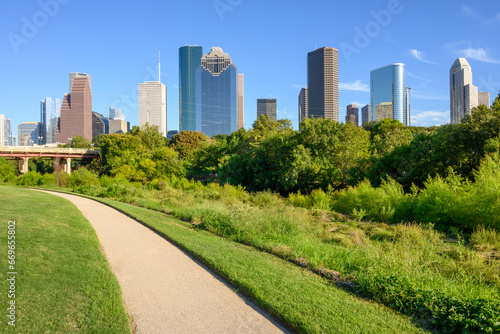 Houston downtown skyscrapers on a sunny day. Buffalo Bayou Park. Texas, USA
