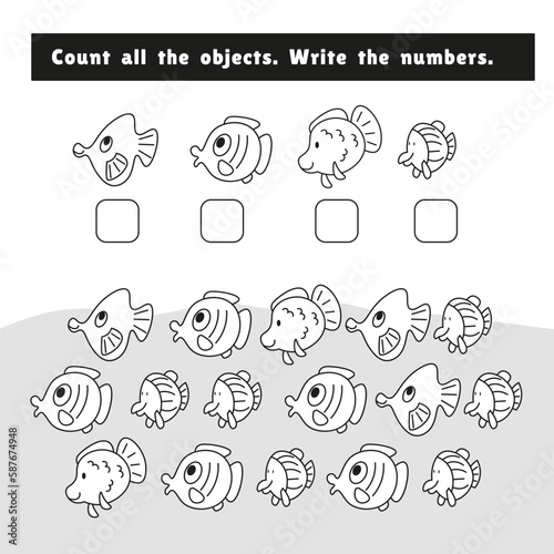 How many objects in the picture. Game for children. Count and write numbers. Educational puzzle game for children. Sea animals in cartoon style. Black and white vector illustration.