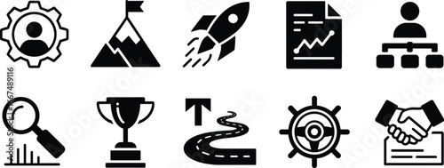 HR gear person, goal mountain, rocket launch, analytics document, leadership hierarchy, chart magnifier, trophy award, progress road, ship wheel, handshake agreement illustration