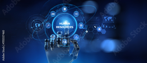 HR Human Resources Management Illustrated with a Robot Hand Pressing a Button on a Virtual Screen. 3D render.