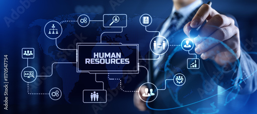HR Human resources management Recruitment Headhunting. Businessman pressing button on screen.