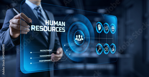 HR Human resources management Recruitment Headhunting. Businessman pressing button on screen.