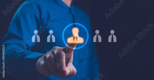 HR, Human Resources Recruitment Concept. Representing the concept of human resources, recruitment, and headhunting in a business setting. HR manager interacting with digital icons highlighting.