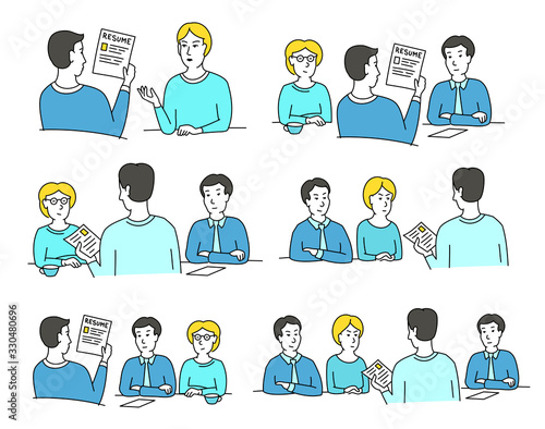 HR interview sketch set. Screening, talking with a job applicant. Male recruiter hired, reading an employee curriculum vitae resume. Vector cartoon.