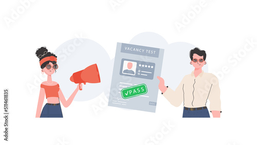 HR team. Girl with a mouthpiece. A man with a job test passed. Job search and human resource concept. Vector illustration in a flat style.