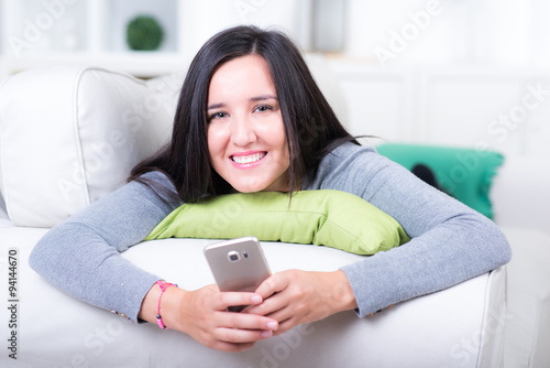 Hübsche brünette Frau mit Mobiltelefon auf dem Sofa
