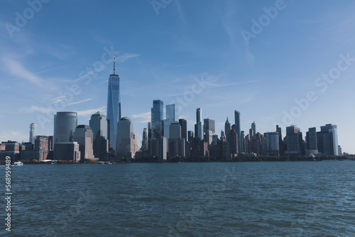Hudson river harbor with Manhattan skyscrapers in New York City under blue sky.